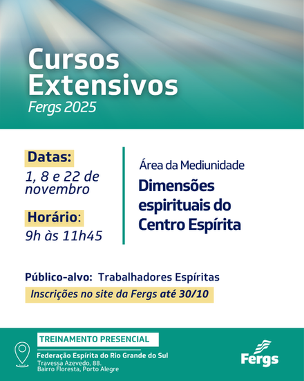 A Área de Estudo do Espiritismo e a Área de Mediunidade, vinculadas à Vice-Presidência Doutrinária da Federação Espírita do RS, convidam para os cursos extensivos que serão realizados no mês de novembro presencialmente na sede da Fergs, localizada na Travessa Azevedo, nº 88, Bairro Floresta, em Porto Alegre. Confira: